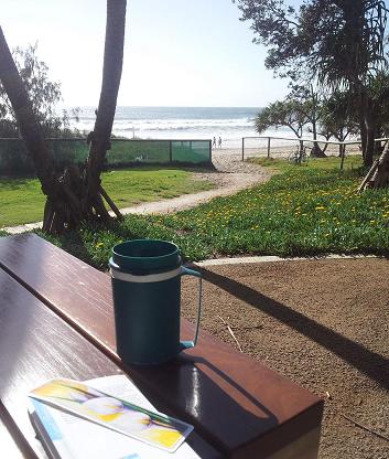 Colourful parrots are squawking in the garden as I head for the beach with my coffee and “someone’s baby” from my to-be-read pile.