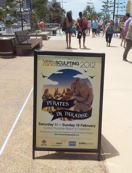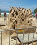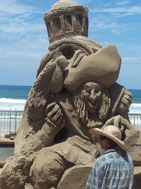 It’s the Australian Sand Sculpting Championships for 2012 and they are busy shaping, others contemplating, these works of art as the Pirate theme emerges from the sand. They are huge, amazingly beautiful and delicately carved. One of the artists wears a pirate scarf knotted under his hair at the back and with the seas behind him really fits in.